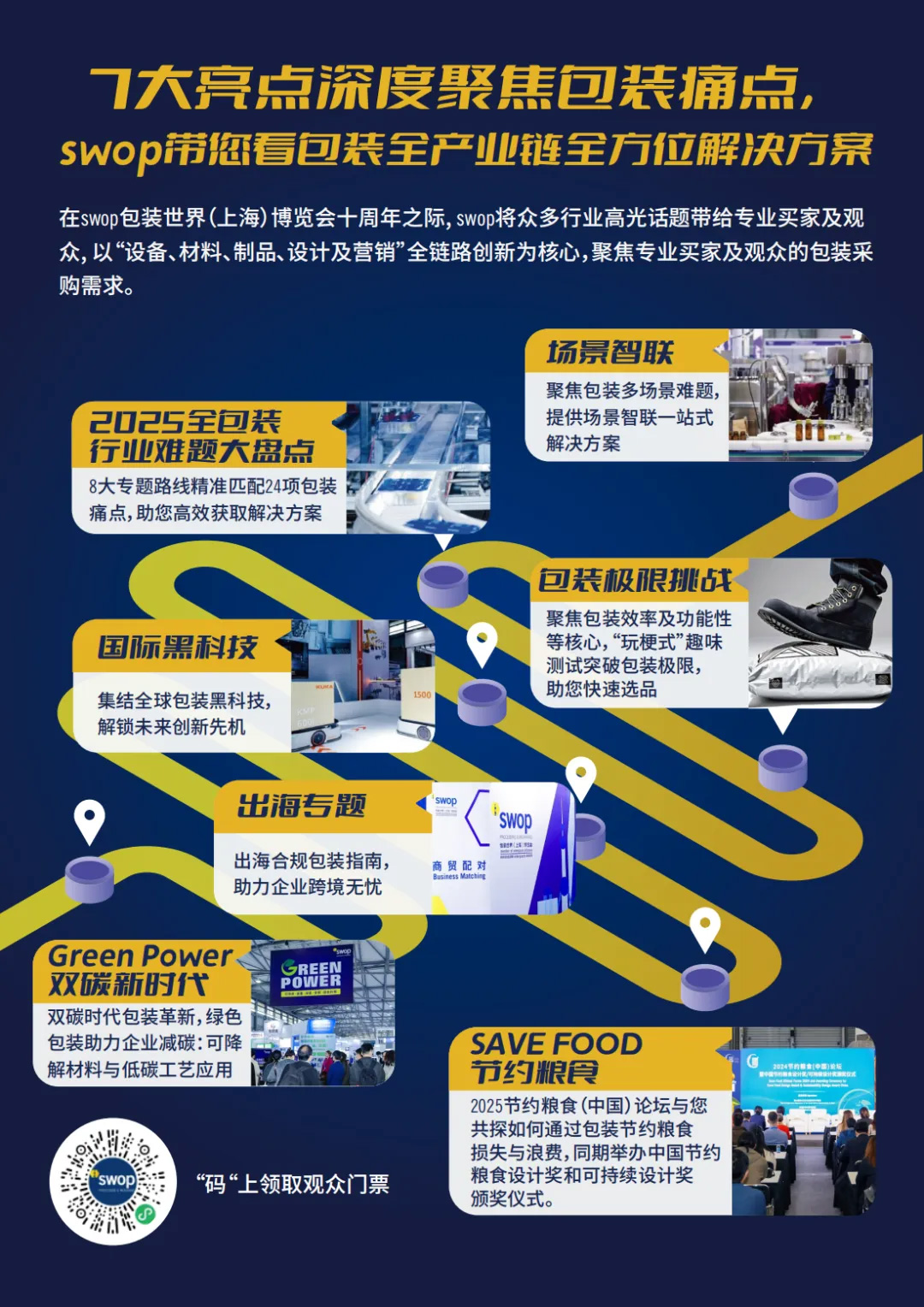 在展会十周年之际,swop以“设备·材料·制品·设计及营销”全链路创新为核心,将众多行业高光话题带给专业买家与观众。无论您来自食品、饮料、日化、医药、甜品烘焙,还是非食品消费品与工业品领域,swop都将精准触达您的采购与升级需求,提供全产业链的一站式解决方案。 swop 2025「展前预览」重磅发布!7大亮点、24条参观路线、精选展品、前沿论坛全景揭晓。
