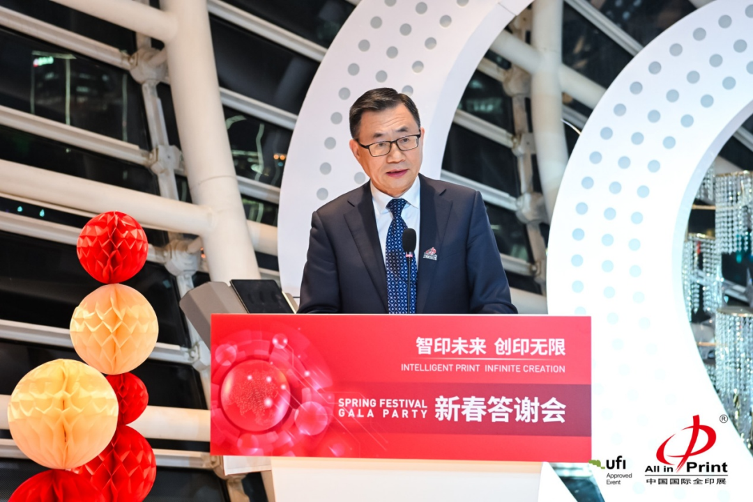 中国印刷技术协会理事长刘晓凯在致辞中,代表中国印刷技术协会及主办三方对莅临现场的各位嘉宾致以诚挚感谢和新春祝福。他指出,过去一年,中国印刷业在转型中突破,在创新中前行,这背后是每一位企业家的坚守深耕与不懈努力。中国国际全印展作为全球极具影响力的印刷专业展会,已成功汇聚五大洲126个国家和地区的展商,吸引逾10万行业精英参与,生动印证了“蓬勃发展的中国印刷业为各国企业提供更多机遇”的深刻内涵。他表示,第十届全印展将启用10大展馆、展陈面积达12万平方米,届时200多个国际专业买家团将到场、百余场高质量同期活动将同步开展,中外知名企业的前沿技术与创新方案将集中亮相,集中展现印刷产业从“制造”向“智造”的升级跃迁。中国印刷技术协会将持续发挥桥梁纽带作用,紧扣党的二十届四中全会部署,全力支持企业家深耕市场,推动中国印刷业从“印刷大国”向“印刷强国”跨越,为全球印刷产业繁荣贡献中国力量。